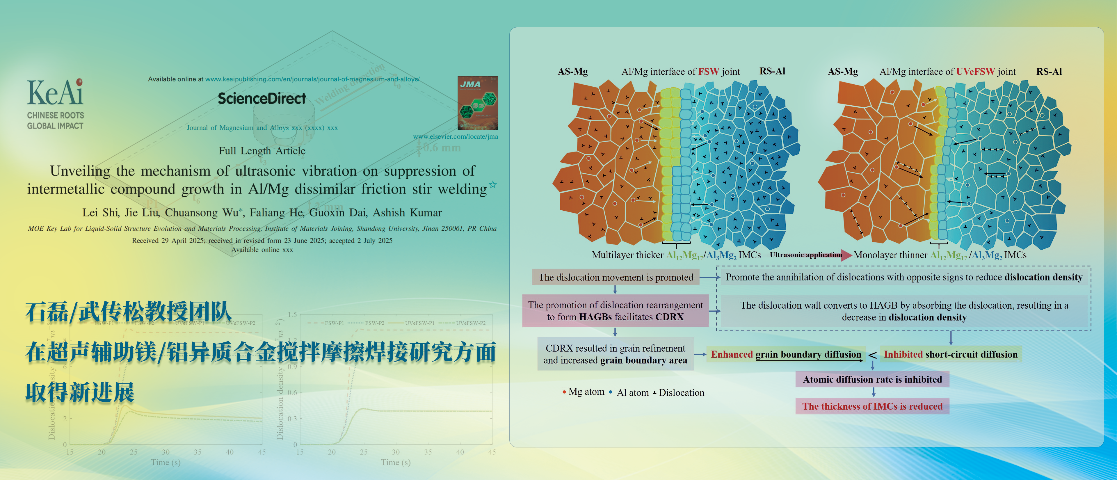 石磊/武传松教授团队在超声辅助镁/铝异质合金搅拌摩擦焊接研究方面取得新进展设计:付英慧供图:宣传部